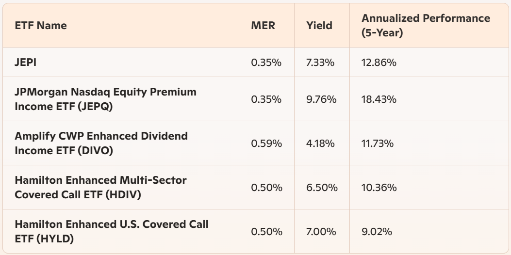 This is a comparison of the JEPI ETF and similar alternatives, focusing on their Management Expense Ratios (MER), yields, and annualized performances.