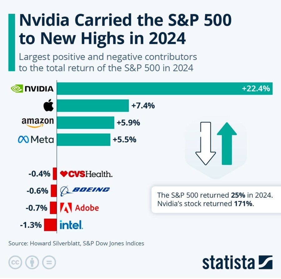 The S&P 500 saw an exceptional bull market in 2024, boasting a 25% return. As depicted in the image below, NVIDIA emerged as the largest positive contributor, accounting for 22.4% of the index's overall return. Other notable contributors were Amazon (+7.4%), Meta (+5.9%), and Alphabet (+5.5%). On the downside, CVS Health (-0.4%), Boeing (-0.6%), Adobe (-0.7%), and Intel (-1.3%) were the largest detractors from the S&P 500's performance.