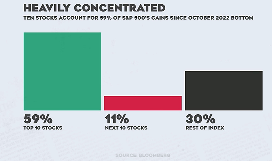 Here’s another chart to consider. Since the market bottomed in October 2022, nearly 60% of the index’s performance has been driven by the top 10 stocks. If you subscribe to the theory of reversion to the mean, you’ll need to hope that the remaining 40% of stocks can deliver improved returns in 2025. Matching these gains again in 2025 will be a significant challenge. As mentioned in the previous edition, the outlook for 2025 depends on earnings exceeding expectations; otherwise, we could face a substantial correction.