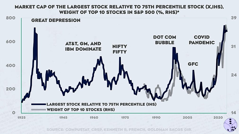 This graph illustrates the impact of the weight of the top 10 stocks in the S&P 500 for 2024, including giants like Microsoft, Apple, Nvidia, Google, Amazon, Meta, and others. By examining similar periods of high concentration in the past, we can observe consistent patterns. Do you know what happened next? The essential takeaway is that a high concentration of assets within a portfolio significantly increases risk.