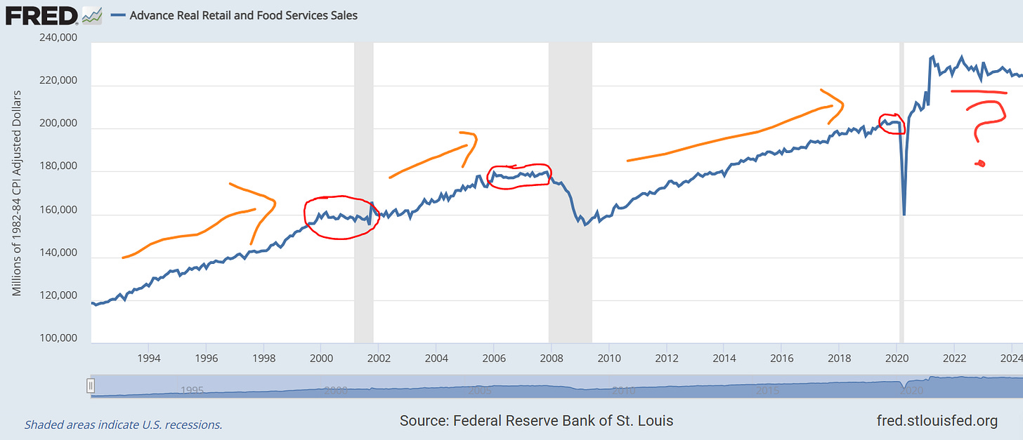 Although this chart focuses on the US, it presents an intriguing insight. The shaded areas signify periods of recession. What can be observed before these recessions? Retail sales typically stagnated and failed to grow. This pattern of stagnation has been evident since 2021. Could this be a sign of an impending recession, suggesting that the US market might face some challenges? Only time will tell.
