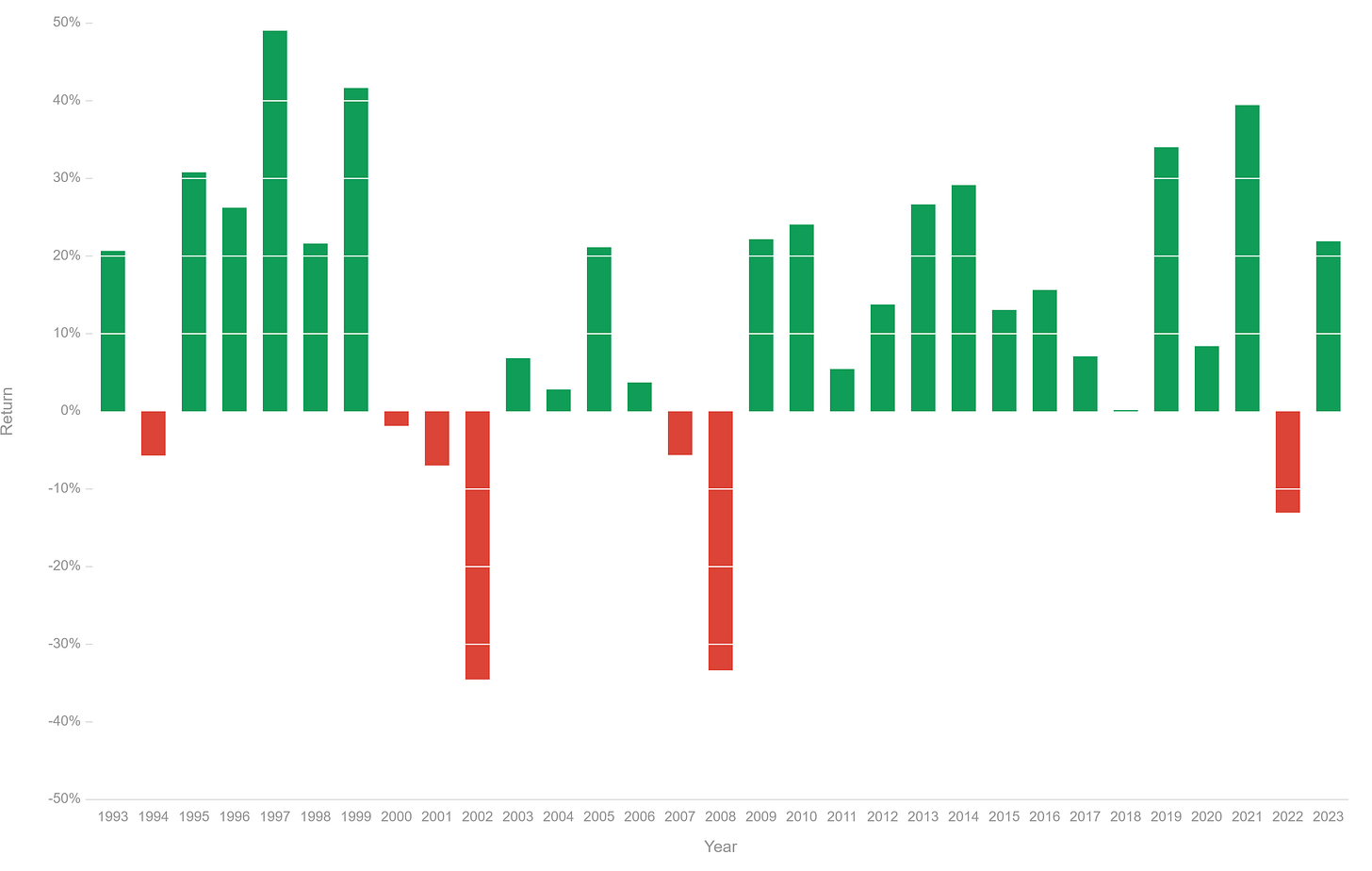 Instead, in most cases, it either massively overperforms or underperforms. To term Howard Marks, there are ‘excesses’ and ‘corrections’.