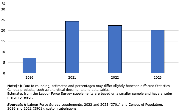 Around 20.1% of employees in Canada typically work from home, compared to 12.7% of employees in the United States who mainly work from home. The majority of these individuals are employed in the finance, insurance, and IT sectors.