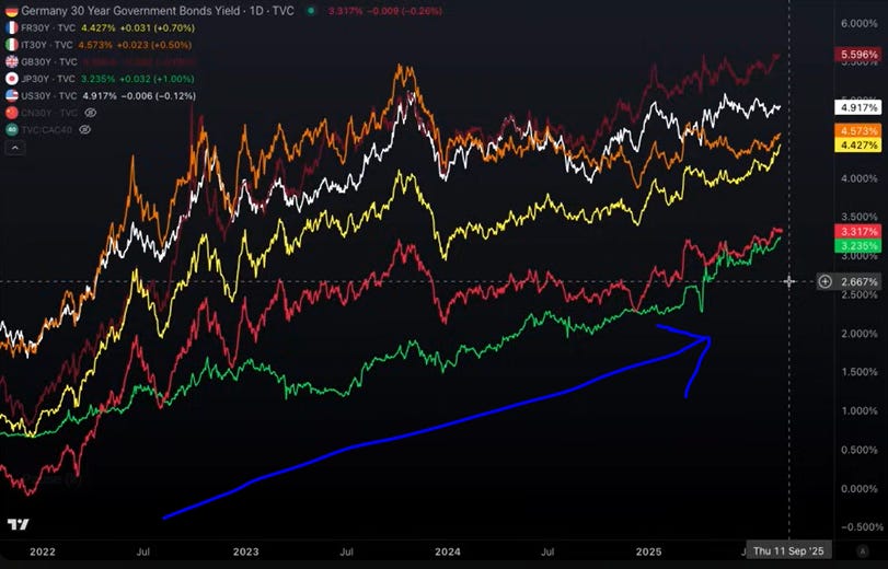 Take a look at 30-year yields across major economies—they’re climbing, even after rate cuts. Now imagine what happens to U.S. long-end yields once the Fed begins its own cutting cycle. Don’t be surprised when the long-end keeps surging upward. Understand that printing more money (QE) is not the answer anymore as the risk will be priced elsewhere, likely the long-end.