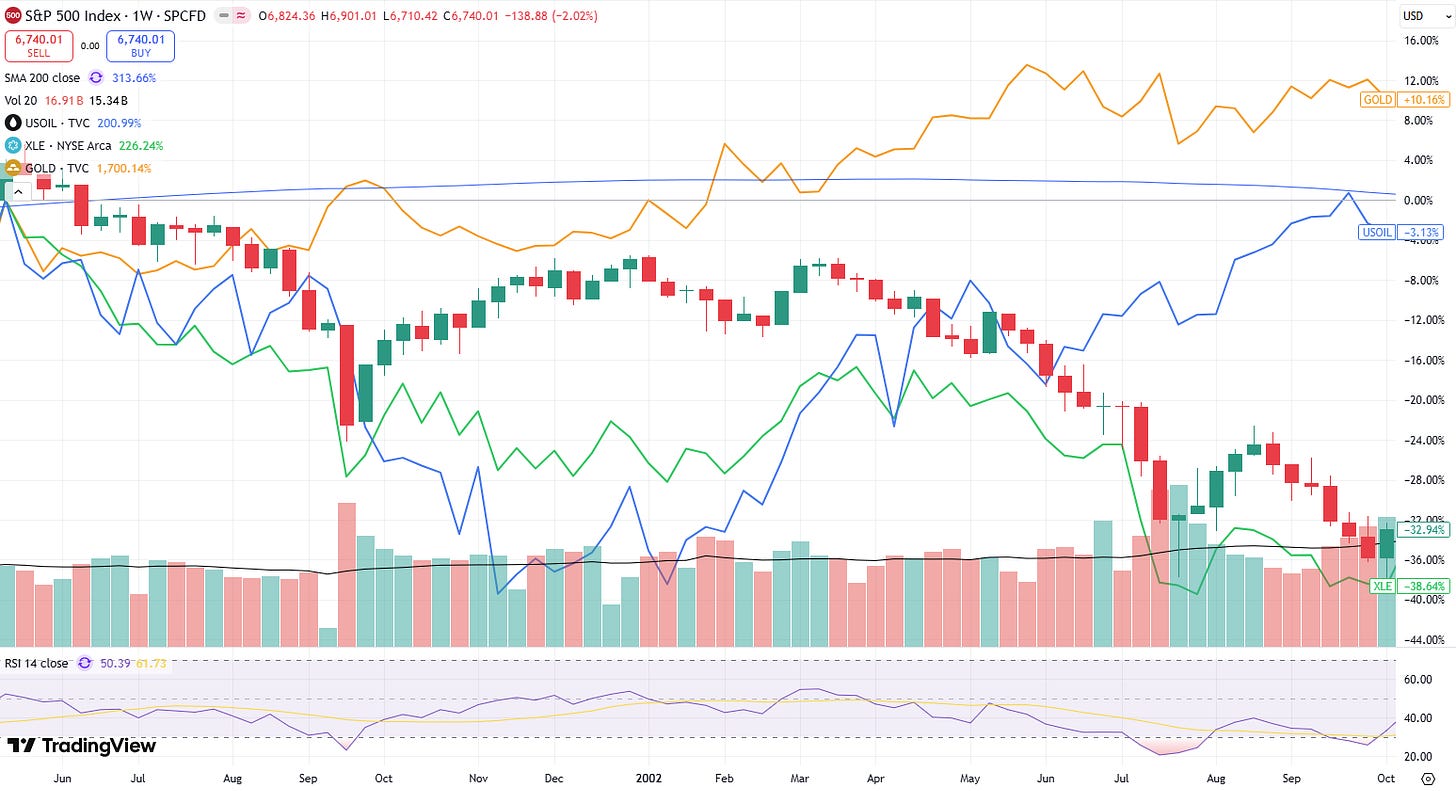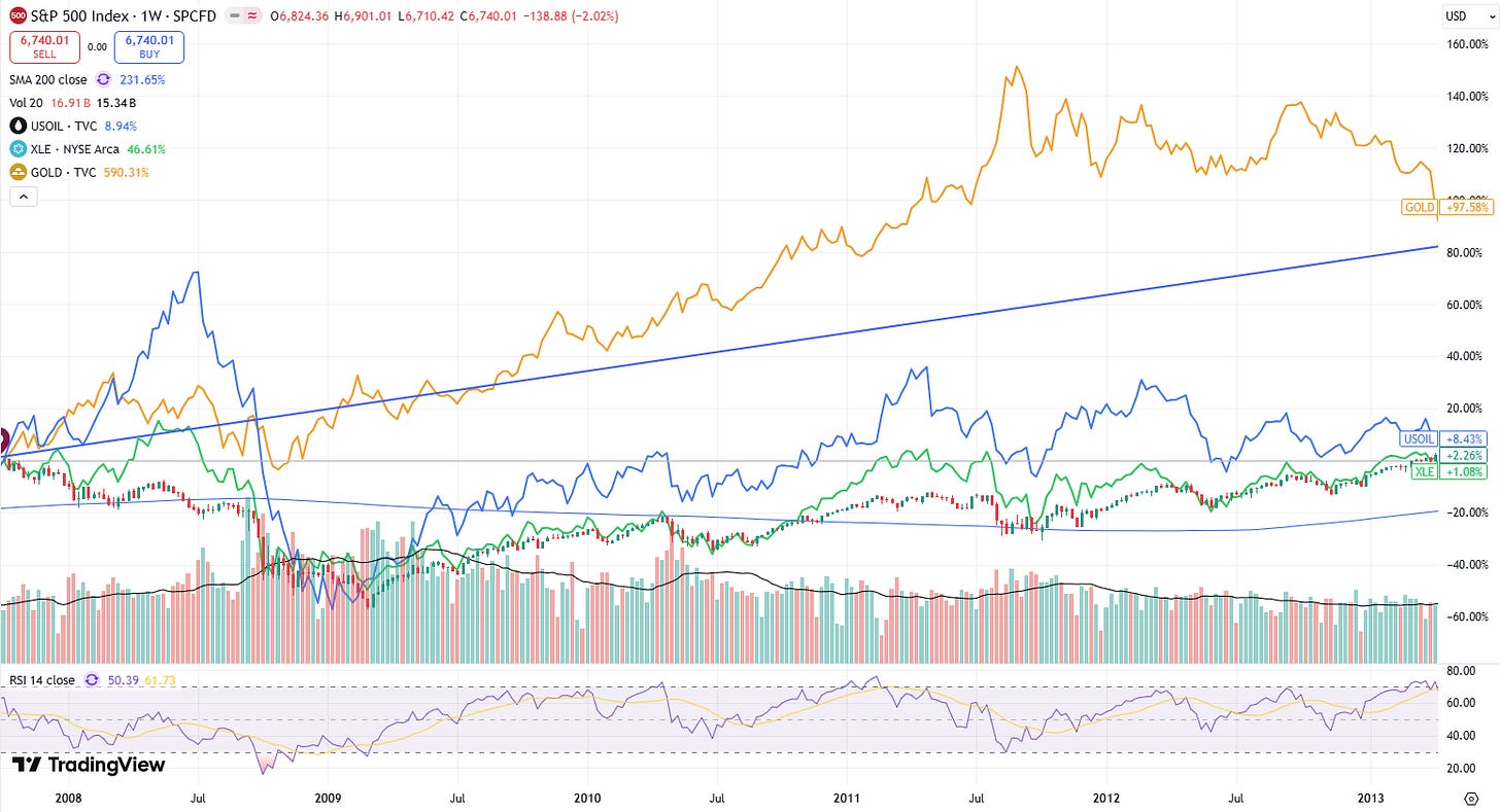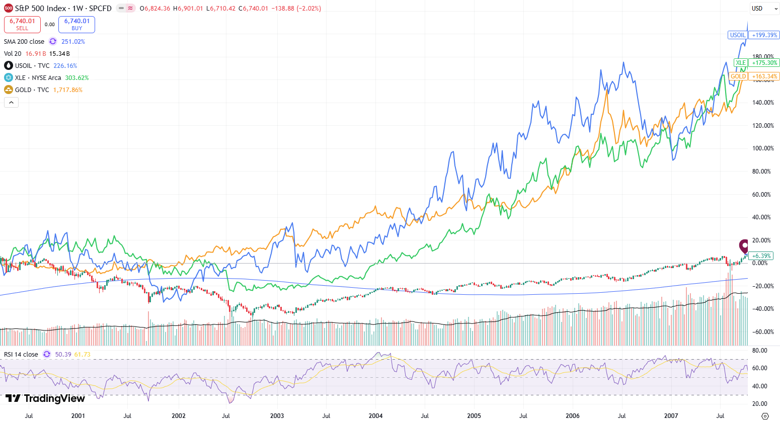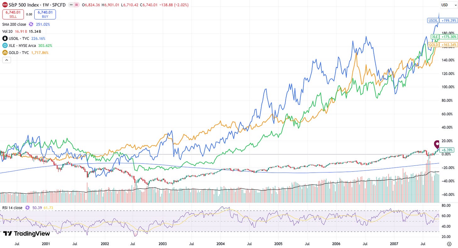Oil prices were scraping along the bottom when the SPY peaked during the dot‑com era. From that point on, while the SPY drifted sideways, oil quietly began its ascent. And climb it did—roughly 27%—until its own topping phase between September and November of 2000. XLE continued. Gold, as a store of value, held steady.