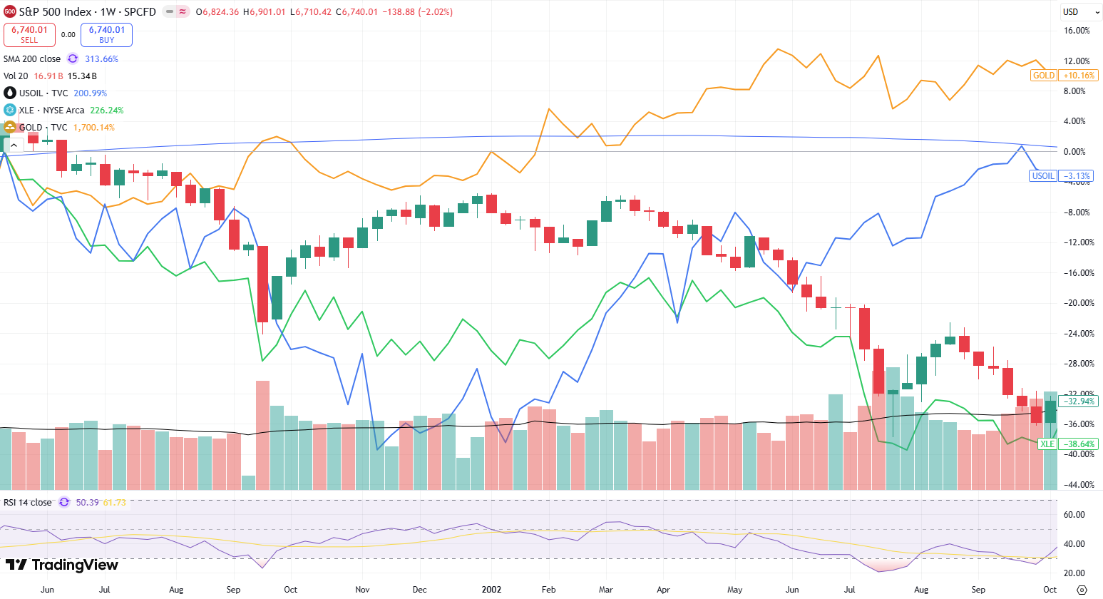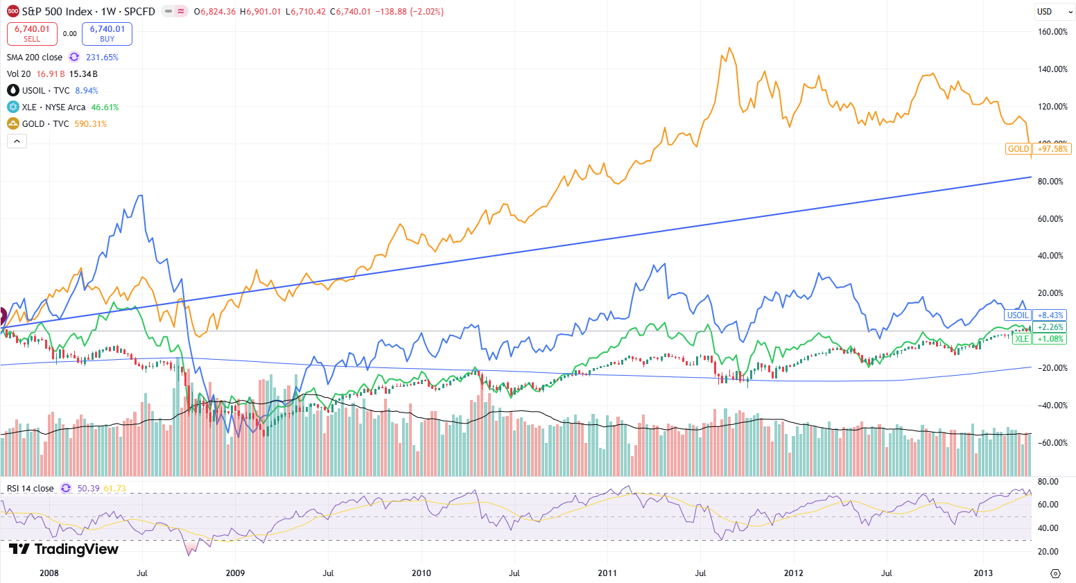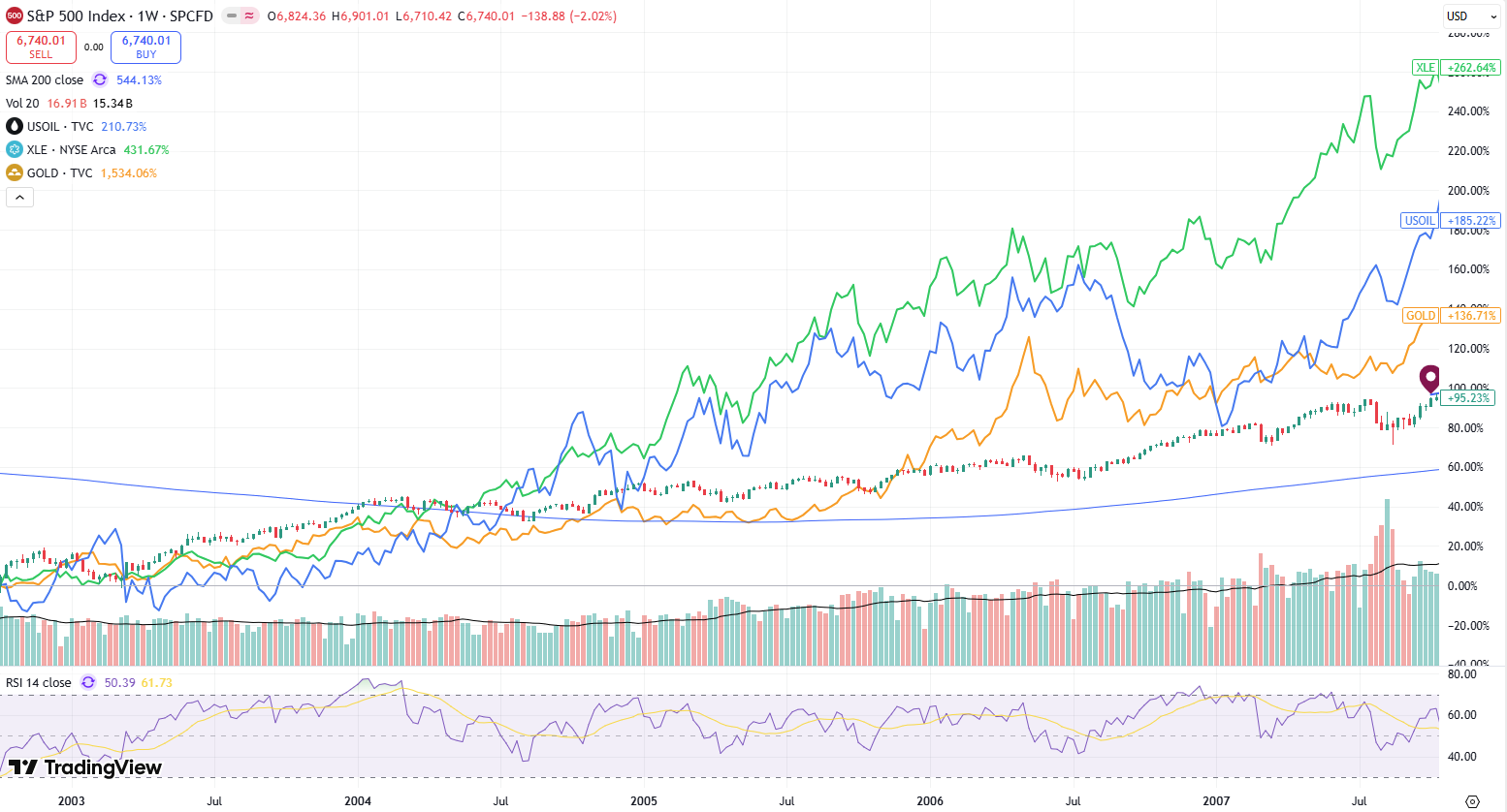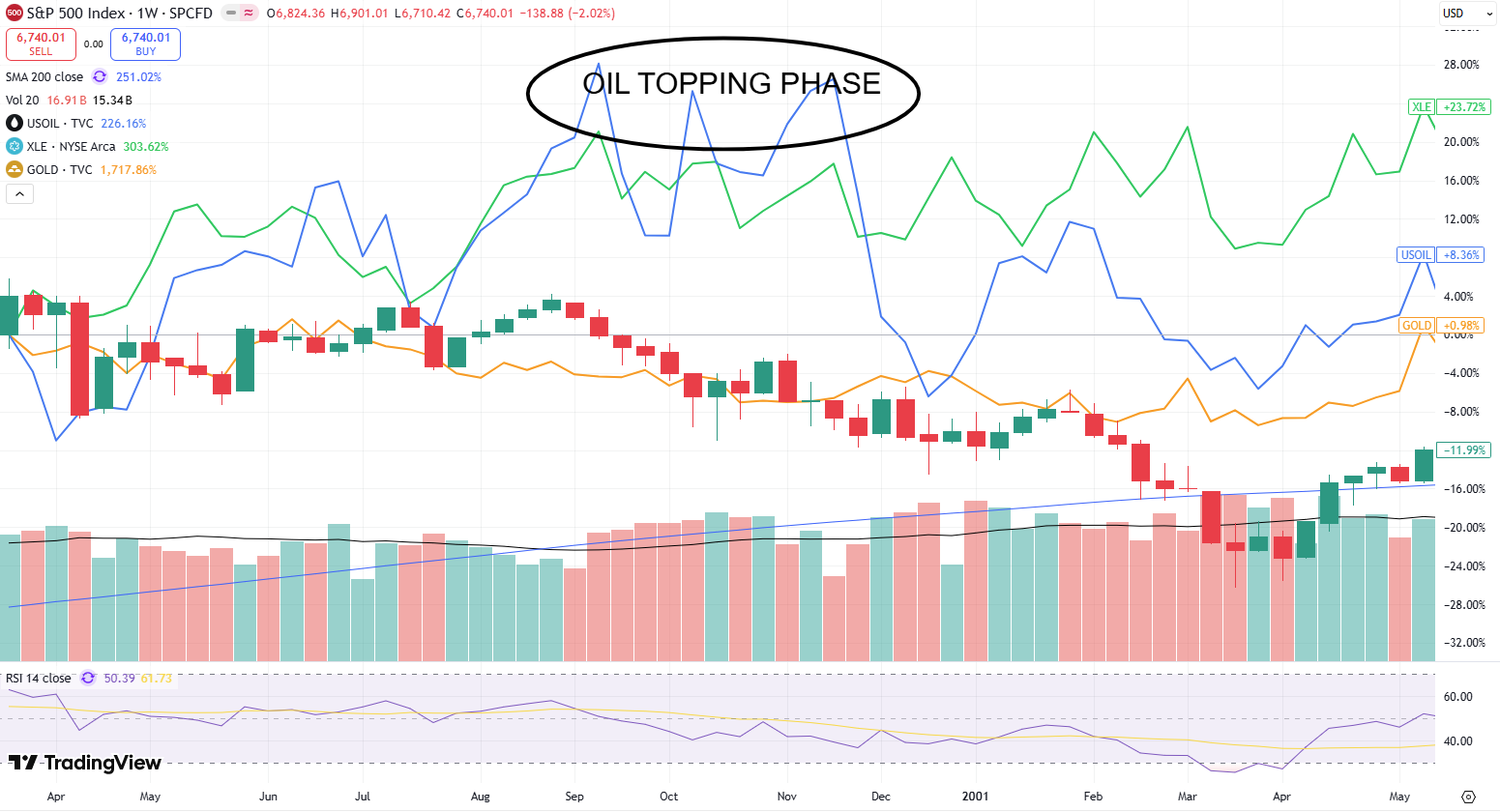 Oil prices were scraping along the bottom when the SPY peaked during the dot‑com era. From that point on, while the SPY drifted sideways, oil quietly began its ascent. And climb it did—roughly 27%—until its own topping phase between September and November of 2000. XLE continued. Gold, as a store of value, held steady.