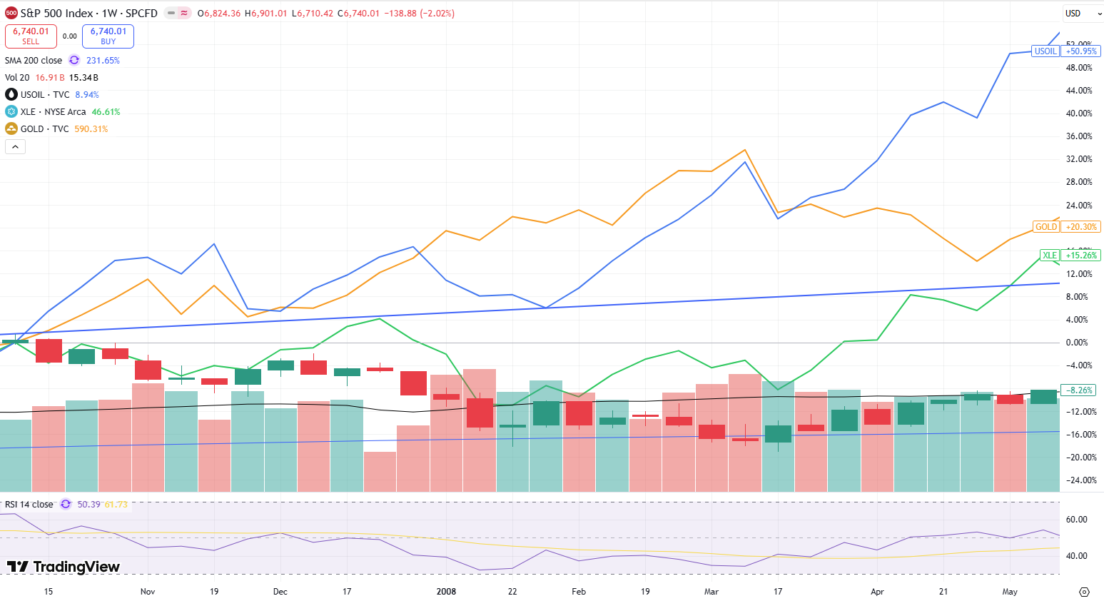 This chart makes the picture unmistakably clear. As major indices like the SPY reach their peak, commodities often enjoy one last surge before the full unwinding of the crash cycle. Just look at the oil price—violent upside swings that strain the entire system. That kind of energy shock tightens liquidity, slows economic activity, and ultimately sends markets into a freefall because no one can sustain those elevated costs.