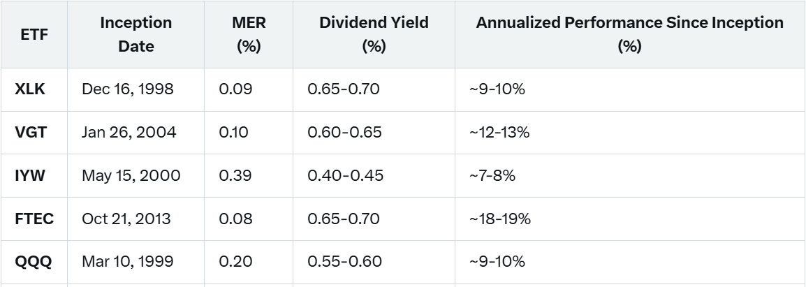 This is a comparison of the XLK ETF and similar alternatives, focusing on their Management Expense Ratios (MER), yields, and annualized performances.